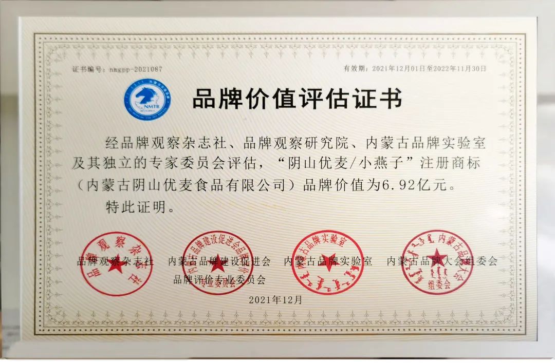 大會還發(fā)布了2021年度“內(nèi)蒙古百強(qiáng)品牌價(jià)值評估報(bào)告”,經(jīng)權(quán)威機(jī)構(gòu)及專家委員會評估,陰山優(yōu)麥品牌價(jià)值為6.92億元。